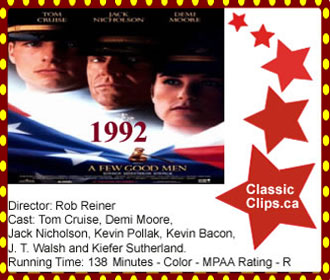 A FEW GOOD MEN (1992) In this military courtroom drama based on the play by Aaron Sorkin, Navy lawyer Lt. Daniel Kaffee (Tom Cruise) is assigned to defend two Marines, Pfc. Louden Downey (James Marshall) and Lance Cpl. Harold Dawson (Wolfgang Bodison), who are accused of the murder of fellow leatherneck Pfc. William Santiago (Michael de Lorenzo) at the U.S. Navy base at Guantanamo Bay, Cuba. Kaffee generally plea bargains for his clients rather than bring them to trial, which is probably why he was assigned this potentially embarassing case, but when Lt. Commander JoAnne Galloway (Demi Moore) is assigned to assist Kaffee, she is convinced that there's more to the matter than they've been led to believe and convinces her colleague that the case should go to court. Under questioning, Downey and Dawson reveal that Santiago died in the midst of a hazing ritual known as "Code Red" after he threatened to inform higher authorities that Dawson opened fire on a Cuban watchtower. They also state that the "Code Red" was performed under the orders of Lt. Jonathan Kendrick (Kiefer Sutherland). Kendrick's superior, tough-as-nails Col. Nathan Jessup (Jack Nicholson), denies any knowledge of the order to torture Santiago, but when Lt. Col. Matthew Markinson (J.T. Walsh) confides to Kaffee that Jessup demanded the "Code Red" for violating his order of silence, Kaffee and Galloway have to find a way to prove this in court. Director: Rob Reiner. Cast: Tom Cruise, Demi Moore, Jack Nicholson, Kevin Pollak, Kevin Bacon, J. T. Walsh and Kiefer Sutherland. |