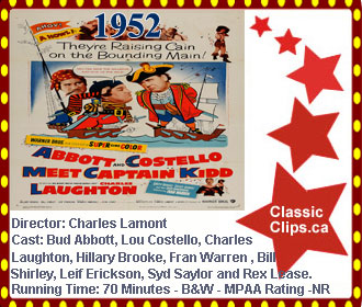 ABBOT AND COSTELLO MEET CAPTAIN KID (1952) Rocky and Puddin' Head are waiting tables at an inn on Tortuga when a letter given them by Lady Jane for delivery to Martingale gets switched with a treasure map. Kidd and Bonney kidnap them to Skull Island to find said treasure. Director: Charles Lamont. Cast: Bud Abbott, Lou Costello, Charles Laughton, Hillary Brooke, Fran Warren, |