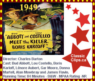 ABBOT AND COSTELLO MEET THE KILLER BORIS KARLOFF (1949) Freddie Phillips is a bellhop at the Lost Caverns Hotel and finds himself the main suspect of a murder. Hotel detective Casey Edwards looks to help Freddie clear himself. Swami Talpur tries to hypnotize Freddie into confessing, but Freddie is too stupid for the plot to work. Inspector Wellman uses Freddie to get the killer. Director: Charles Barton. Cast: Bud Abbott, Lou Costello, Boris Karloff, Lénore Aubert, Gar Moore, Donna Martell, Alan Mowbray and James Flavin. |