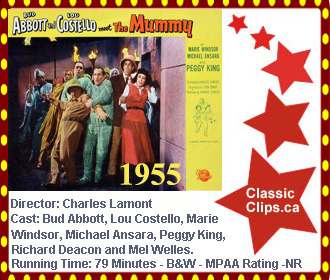 ABBOT AND COSTELLO MEET THE MUMMY (1955) The bumbling comedians try to make a buck guarding a valuable mummy, before they're drawn into a plot by cult worshippers to steal a cursed medallion. Director: Charles Lamont. Cast: Bud Abbott, Lou Costello, Marie Windsor, Michael Ansara, Peggy King, Richard Deacon and Mel Welles. |