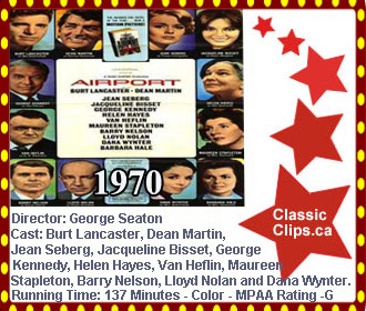 AIRPORT (1970) Seven stories tied into one movie! Mel Bakersfeld (Burt Lancaster), the general manager of a Chicago area airport, must contend with a massive snowstorm, the detonation of a bomb on a Boeing 747 and clearing runway 29 of a snowed in Boeing 707 for the ill fated Boeing 747, on which other nuisances are occurring, including a sly, elderly stowaway, Ada Quonsett (Helen Hayes), who has been taking the airport for a ride for years. Director: Jim Abrahams, David Zucker and Jerry Zucker. Cast: Burt Lancaster, Dean Martin, Jean Seberg, Jacqueline Bisset, George Kennedy, Helen Hayes, Van Heflin, Maureen Stapleton, Barry Nelson, Lloyd Nolan and Dana Wynter. |