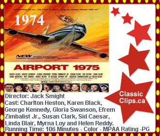 AIRPORT 1975 (1974) When the pilot of a small aircraft has a heart attack and crashes his plane into the cockpit of a Boeing 747, several members of the flight crew are killed and the pilot is blinded. Miraculously, the 747 stays in the air on auto-pilot with flight attendant Nancy Prior at the controls. Ground controllers, including her boyfriend Alan Murdock, try to teach her the basics but they soon realize they will have to get a trained pilot into the cockpit. Their first attempt fails and Murdock realizes he will have to do it. Meanwhile, various passengers have their own problems, including a young girl on her way for a life saving operation. Director: Jack Smight. Cast: Charlton Heston, Karen Black, George Kennedy, Gloria Swanson, Efrem Zimbalist Jr., Susan Clark, Sid Caesar, Linda Blair, Dana Andrews, Roy Thinnes, Nancy Olson, Ed Nelson, Myrna Loy, |