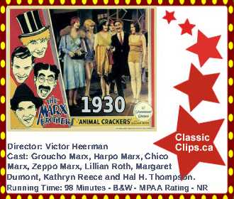 ANIMAL CRACKERS (1930) The well-known explorer and hunter Captain Spaulding has just returned from Africa, and is being welcomed home with a lavish party at the estate of influential society matron Mrs. Rittenhouse (Margaret Dumont) when a valuable painting goes missing. The intrepid Captain Spaulding attempts to solve the crime with the help of his silly secretary Horatio Jamison, while sparring with the anarchic Signor Emanuel Ravelli and his nutty sidekick The Professor. Director: Victor Heerman. Cast: Groucho Marx, Harpo Marx, Chico Marx, Zeppo Marx, Lillian Roth, Margaret Dumont, Kathryn Reece and Hal H. Thompson. |