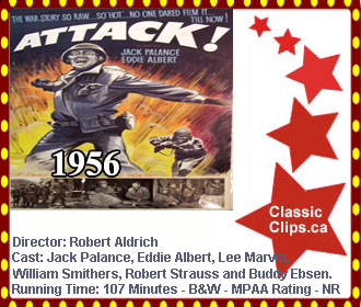 ATTACK! (1956) Europe 1944: Fox company (call sign "Fragile Fox") is a US Army National Guard infantry unit based in a Belgian town near the front line. They are led by Captain Erskine Cooney (Eddie Albert), who appears to be better at handling red tape than combat. When Lieutenant Joe Costa (Jack Palance) sends a squad to take a pillbox, Cooney agrees to provide covering fire but freezes at the critical moment leading to the slaughter of Costa's squad. Director: Robert Aldrich. Cast: Jack Palance, Eddie Albert, Lee Marvin, William Smithers, Robert Strauss and Buddy Ebsen. |