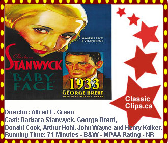 BABY FACE (1933) A young woman, sexually exploited all her life, decides to turn the tables and exploit the hapless men at a big city bank - by gleefully sleeping her way to the top. Lilly (Baby Face) sleeps her way from basement speakeasy bartender, literally floor by floor, to the top floor of a New York office building. Bank sub-manager Jimmy McCoy finds her a job in the bank only to be cast aside as she hooks up with the bank's president. Director: Alfred E. Green. Cast: Barbara Stanwyck, George Brent, Donald Cook, Arthur Hohl, |