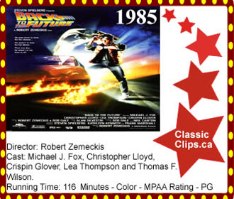 BACK TO THE FUTURE (1985) It is the year 1985. Marty McFly, a mild-mannered high school student, stopped by Dr. Emmett L. Brown's laboratory to play around with an amplifier. Then he receives a message from Doc that he needs help from him for Doc's latest invention, a time machine made out of a DeLorean sports car that can travel through time instantaneously when it reaches a speed velocity of 88 MPH. Then, Doc was gunned down by Libyan Nationalists, Marty makes an effort to escape from the Lybians by using the time machine. Then Marty accidentally warps himself into 1955. Where he meets both of his parents when they were teenagers, then Marty unintentionally interrupts his parent's first meeting together, he then finds a younger version of Doc and together they try to find a way to get Marty's parents-to-be back together, and to get Marty back to 1985. Director: Robert Zemeckis. Cast: Michael J. Fox, Christopher Lloyd, Crispin Glover, Lea Thompson and Thomas F. Wilson. |
