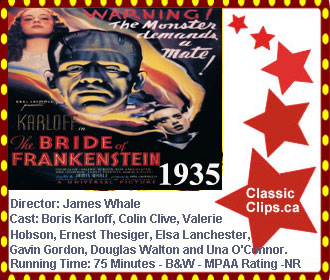 BRIDE OF FRANKENSTEIN (1935) Dr. Frankenstein is forced to tempt fate once again by creating a suitable mate for his monster - with irreconcilable, irrevocable and destructive consequences. Director: James Whale. Cast: Boris Karloff, Colin Clive, Valerie Hobson, Ernest Thesiger, Elsa Lanchester, Gavin Gordon, Douglas Walton and Una O'Connor. |