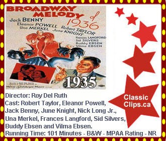 BROADWAY MELODY OF 1936 (1935) When Broadway producer Robert Gordon (Robert Taylor) struggles to finance his new show, a wealthy widow, Lillian Brent (June Knight), offers him an idea: cast her and she will fund the project. Catching wind of the deal, columnist Bert Keeler (Jack Benny) blasts Gordon for practicing favoritism, which means when Gordon's former sweetheart, talented performer Irene Foster (Eleanor Powell), auditions for a part, Gordon refuses to cast her. Foster will need to scheme to win the role she deserves. |