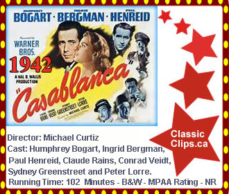 CASABLANCA (1942) Rick Blaine (Humphrey Bogart), who owns a nightclub in Casablanca, discovers his old flame Ilsa (Ingrid Bergman) is in town with her husband, Victor Laszlo (Paul Henreid). Laszlo is a famed rebel, and with Germans on his tail, Ilsa knows Rick can help them get out of the country. Director: Michael Curtiz. Cast: Humphrey Bogart, |