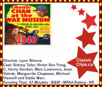 CHARLIE CHAN AT THE WAX MUSEUM (1940) The Chinese detective (Sidney Toler) and his No. 2 son (Sen Yung) seek villains hiding among statues at an infamous wax museum. Director: Lynn Shores. Cast: Sidney Toler, Victor Sen Yung, C. Henry Gordon. Marc Lawrence, Joan Valerie, Marguerite Chapman, Michael Visaroff and Eddie Marr. |