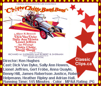 Chitty Chitty Bang Bang (1968) While truant from school, young siblings Jeremy and Jemima meet the beautiful Truly Scrumptious (Sally Ann Howes), who falls for their widowed father, Caractacus Potts (Dick Van Dyke), and his various oddball inventions, including the family's noisy rebuilt car, Chitty Chitty Bang Bang. One day at the beach, Caractacus tells Truly and the children a fanciful fable about the villainous Baron Bomburst (Gert Frobe) and his evil designs on the Potts family car. Director: Ken Hughes. Cast: Dick Van Dyke, Sally Ann Howes, Lionel Jeffries, Gert Fröbe, Anna Quayle, Benny Hill, James Robertson Justice, Robert Helpmann, Heather Ripley and Adrian Hall. |