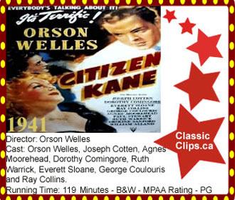 CITIZEN KANE (1941) Orson Welles' "Citizen Kane" is widely considered to be the greatest film to ever come out of Hollywood. The film focuses on a group of reporters who are trying to decipher the last word ever spoken by Charles Foster Kane, the millionaire newspaper tycoon, Rosebud. The film begins with a news reel detailing Kane's life for the masses, and then from there, shows flashbacks from Kane's life. As the reporters investigate further, the viewers witness a fascinating man's rise to fame and how he eventually fell off of the "top of the world." Director: Orson Welles. Cast: Orson Welles, Joseph Cotten, Agnes Moorehead, Dorothy Comingore, Ruth Warrick, Everett Sloane, George Coulouris and Ray Collins. |
