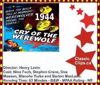 CRY OF THE WEREWOLF (1944) A Romani princess descended from Marie LaTour has the ability to change into a wolf at will, just like her late mother. When she learns that Marie LaTour's tomb has been discovered, she decides to use her talent to kill everyone who knows the location, because it is a sacred secret that only her people are allowed to know. Director: Henry Levin. Cast: Nina Foch, Stephen Crane, Osa Massen, Blanche Yurka and Barton MacLane. |