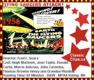 EARTH VS THE FLYING SAUCERS (1956) Hugh Marlowe plays scientist Russell Marvin, who is on-hand when an alien spacecraft lands on earth. The saucermen at first insist that they've come in peace, but Marvin suspects otherwise. Sure enough, the visitors eventually declare their intention to take over the earth within the next 60 days, adding that the military's weapons are useless against them. The two-month window ives Marvin and his cohorts plenty of time to build-up superweapon, and thus stave off the seven-saucer invasion force. Director: Fred F. Sears. Cast: Hugh Marlowe, Joan Taylor, Donald Curtis, Morris Ankrum, John Zaremba, Thomas Browne Henry and Grandon Rhodes. |
