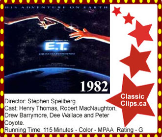 E.T. THE EXTRATERRESTRIAL (1982) A group of aliens visit earth and one of them gets lost and is left behind, stranded on earth. The alien is then discovered by a 10 year old boy, Elliot, and soon the two begin to communicate and start a different kind of friendship in which E.T learns about life on earth and Elliot learns about some new values for the true meaning of friendship. E.T. wants to go home, but if Elliot helps him, he'll lose a friend. Director: Stephen Speilberg. Cast: Henry Thomas, Robert MacNaughton, Drew Barrymore, Dee Wallace and Peter Coyote. |