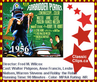 FORBIDDEN PLANET (1956) An expedition is sent from Earth to Altair in the constellation of Aquilae (some 17 light years from Earth) to discover what happened to a colony of settlers on its fourth planet, Altair-4. What they discover (two survivors and a deadly secret that one of them has) is how and why an alien race of geniuses destroyed itself overnight while leaving their technology intact at some point in the distant, distant past. Director: Fred M. Wilcox. Cast: Walter Pidgeon, Anne Francis, Leslie Nielsen, Warren Stevens and Robby the Robot. |