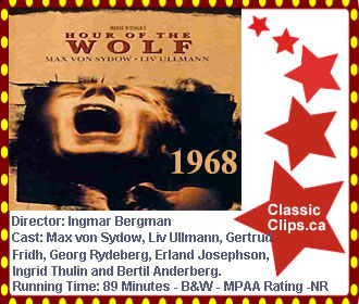 HOUR OF THE WOLF (1968) On a remote island, a troubled artist (Max von Sydow) feels his mind slipping away from him. Troubled by disturbing visions and paranoid delusions, he and his wife (Liv Ullmann) begin to suspect that the haunting memories are the machinations of a bizarre, perverted cult that reside on the other side of the island. The leader of this group (Erland Josephson) may hold the key to the artist's delusions. This is the only horror film in director Ingmar Bergman's legendary body of work. Director: Ingmar Bergman. Cast: Max von Sydow, Liv Ullmann, Gertrud Fridh, Georg Rydeberg, Erland Josephson, Ingrid Thulin, Naima Wifstrand, Ulf Johansson and Gudrun Brost. |