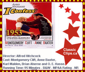 I Confess (1953) Father Logan (Montgomery Clift) is a Catholic priest, but he finds his faith put to the test when he is accused of the murder of a wealthy member of his parish. The real murderer was Otto (O.E. Hasse), a poor German immigrant desperate for money, and Father Logan knows this because Otto confessed it to him. However, Father Logan is bound by the secrecy of the confessional and cannot share this evidence with the police, even if it means his own life. Director: Alfred Hitchcock. Cast: Montgomery Clift, Anne Baxter, Karl Malden, Brian Aherne and O. E. Hasse. |