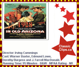 IN OLD ARIZONA (1928) In this early Western, notorious bandit the Cisco Kid (Warner Baxter) is so feared that he rarely has to fire his gun to rob a stagecoach. His ravishing girlfriend, Tonia (Dorothy Burgess), often accuses him of being unfaithful, but he assures her that he loves only her, and even composes a song in her name. When Cavalry Sgt. Mickey Dunn (Edmund Lowe) arrives with a mission to capture or kill the Mexican Robin Hood, Cisco matches wits with him and discovers an unexpected betrayal. Director: Irving Cummings. Cast: Warner Baxter, Edmund Lowe, Dorothy Burgess and J .Farrell MacDonald. |