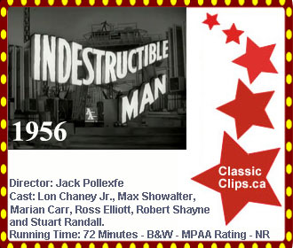INDESTRUCTIBLE MAN (1956) Death row inmate Charles `The Butcher' Benton (Lon Chaney Jr.), seeks revenge on his crooked lawyer who double-crossed him. After his execution, a bizarre experiment brings him back to life with super-natural powers that makes him invincible. Director: Jack Pollexfe. Cast: Lon Chaney Jr., Max Showalter, Marian Carr, Ross Elliott, Robert Shayne and Stuart Randall. |