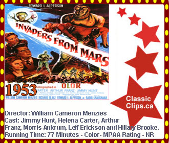 INVADERS FROM MARS (1953) Curious adolescent boy David MacLean (Jimmy Hunt) confronts aliens who have set up base in his backyard. The extraterrestrials intend to use mind control on the local townsfolk. Determined to stop the invaders, who have already co-opted his father (Leif Erickson), he attempts to warn others. But when local law officers also succumb, David teams up with astronomer Stuart Kelston (Arthur Franz) and Dr. Pat Blake (Helena Carter), and the trio must fight together to repel the insidious intruders. Director: William Cameron Menzies. Cast: Jimmy Hunt, Helena Carter, Arthur Franz, Morris Ankrum, Leif Erickson and Hillary Brooke. |