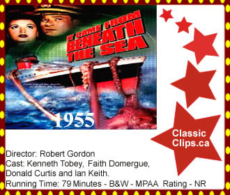 IT CAME FROM BENEATH THE SEA (1955) After an encounter at sea with an unknown underwater creature, a naval commander works with two scientists to identify it. The creature they are dealing with is a giant, radioactive octopus that has left its normal feeding grounds in search of new sources of replenishment. As the creature attacks San Francisco, the Navy tries to trap it at the Golden Gate Bridge but it manages to enter the Bar area leading to a final confrontation with a submarine. Director: Robert Gordon. Cast: Kenneth Tobey, Faith Domergue, Donald Curtis and Ian Keith. |