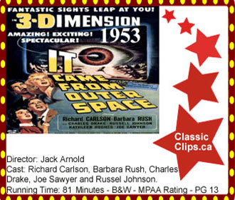 IT CAME FROM OUTER SPACE (1953) John Putnam and Ellen watch a great fireball going down near a mine. Both are the only ones who believe the "thing" is not a meteor but an alien starship. In the following days, people disappear and return, obviously being manipulated in a strange way. After a while, the sheriff becomes distrustful. He and his men enter the mine. But Putnam hopes to reach a peaceful solution and enters the starship. Director: Jack Arnold. Cast: Richard Carlson, Barbara Rush, Charles Drake, Joe Sawyer and Russel Johnson. |