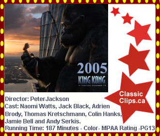 KING KONG (2005) Peter Jackson's expansive remake of the 1933 classic follows director Carl Denham (Jack Black) and his crew on a journey from New York City to the ominous Skull Island to film a new movie. Accompanying him are playwright Jack Driscoll (Adrien Brody) and actress Ann Darrow (Naomi Watts), who is whisked away by the monstrous ape, Kong, after they reach the island. The crew encounters dinosaurs and other creatures as they race to rescue Ann, while the actress forms a bond with her simian captor. Director: Peter Jackson. Cast: Naomi Watts, Jack Black, Adrien Brody, Thomas Kretschmann, Colin Hanks, Jamie Bell and Andy Serkis . |