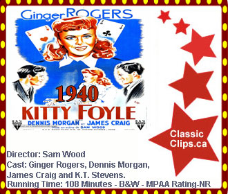 KITTY FOYLE (1940) Working-class Philadelphia teen Kitty Foyle (Ginger Rogers) dreams of life in the city's fashionable society circles, but when she impulsively weds her former boss, wealthy Wyn Strafford (Dennis Morgan), his family disapproval is to, o severe for the young couple to overcome. Working in New York as a salesgirl in a fancy department store, Kitty meets and falls for kindhearted doctor Mark Eisen (James Craig), but when the remarried Wyn asks her to run away with him, she faces a difficult choice. Director: Sam Wood. Cast: Ginger Rogers, Dennis Morgan, James Craig and K. T. Stevens. |