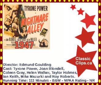 NIGHTMARE ALLEY (147) Roustabout Stanton Carlisle (Tyrone Power) joins a traveling carny and unsuccessfully schemes to figure out the mind-reading act of Mademoiselle Zeena (Joan Blondell) and her alcoholic husband, Pete (Ian Keith). But when Pete dies, Zeena is forced to take on Stanton as a partner, and he quickly proves more gifted than his predecessor. Ambitious to a fault, Carlisle abandons Zeena and the carny to reinvent himself as The Great Stanton, wowing high-class audiences in a Chicago hotel. Director: Edmund Goulding. Cast: Tyrone Power, Joan Blondell, Coleen Gray, Helen Walker, Taylor Holmes, Ian Keith, Mike Mazurki and Roy Roberts.. |