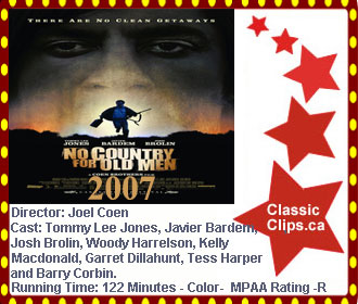 NO COUNTRY FOR OLD MEN (2007) While out hunting, Llewelyn Moss (Josh Brolin) finds the grisly aftermath of a drug deal. Though he knows better, he cannot resist the cash left behind and takes it with him. The hunter becomes the hunted when a merciless killer named Chigurh (Javier Bardem) picks up his trail. Also looking for Moss is Sheriff Bell (Tommy Lee Jones), an aging lawman who reflects on a changing world and a dark secret of his own, as he tries to find and protect Moss. Director: Joel Coen. Cast: Tommy Lee Jones, Javier Bardem, Josh Brolin, Woody Harrelson, Kelly Macdonald, Garret Dillahunt, Tess Harper and Barry Corbin. |
