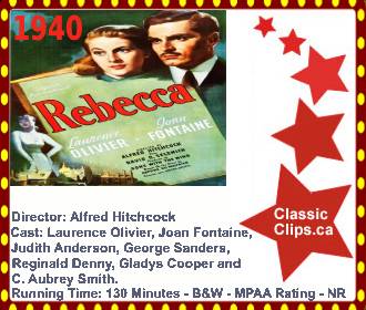 REBECCA (1940) A young woman (Joan Fontaine) who marries a fascinating widower discovers that she must live in the shadow of his former wife, Rebecca, who died mysteriously several years earlier. The young wife must come to grips with the terrible secret of her handsome, cold husband, Max De Winter (Laurence Olivier). She must also deal with the jealous, obsessed Mrs. Danvers (Judith Anderson), the housekeeper, who will not accept her as the mistress of the house. Director: Alfred Hitchcock. Cast: Laurence Olivier, Joan Fontaine, Judith Anderson, George Sanders, Reginald Denny, Gladys Cooper and C. Aubrey Smith. |