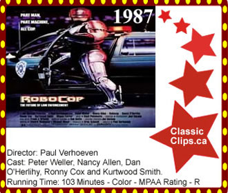 ROBOCOP (1987) In the aftermath of economic and moral collapse, the city of Detroit becomes a cesspool of crime and anarchy, forcing the underfunded police to fall under the stewardship of corporate juggernaut OCP. In his first day patrolling Old Detroit, Officer Alex Murphy is killed by feared gang leader Clarence Boddicker. OCP scientists are able to use Murphy's remains to build a cybernetic soldier codenamed Robocop. Dubbed the future of law enforcement, Robocop begins a one-man war on crime. When memories of his former life begin to surface, Robocop becomes obsessed with tracking down Boddicker and claiming revenge, even as his handlers try to rein him inion. Director: Paul Verhoeven. Cast: Peter Weller, Nancy Allen, Dan O'Herlihy, Ronny Cox and Kurtwood Smith. |