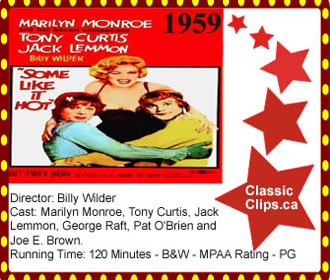 SOME LIKE IT HOT (1959) Two struggling musicians witness the St. Valentine's Day Massacre and try to find a way out of the city before they are found and killed by the mob. The only job that will pay their way is an all girl band so the two dress up as women. In addition to hiding, each has his own problems; One falls for another band member but can't tell her his gender, and the other has a rich suitor who will not take "No," for an answer. Director: Billy Wilder. Cast: Marilyn Monroe, Tony Curtis, Jack Lemmon, George Raft, Pat O'Brien and Joe E. Brown.. |