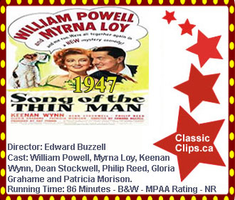 SONG OF THE THIN MAN (1947) Tommy Drake (Philip Reed), a musician aboard a gambling ship, is shot and killed while trying to break into a safe. Later, amateur sleuths Nick (William Powell) and Norah (Myrna Loy) receive a visit from Phil Brant, Drake's former boss and the the main suspect in his murder. After they give Brant up to the authorities, they start digging around for clues. The pair question Brant's wife and one of Drake's musician colleagues until they start to piece together the intricate puzzle. Director: Edward Buzzell. Cast: William Powell, Myrna Loy, Keenan Wynn, Dean Stockwell, Philip Reed, Gloria Grahame and Patricia Morison. |