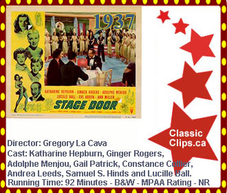 STAGE DOOR (1937) A boardinghouse for female theater actresses gets a new arrival in the form of Terry Randall (Katharine Hepburn), an upper-class woman pursuing her dreams against her wealthy father's wishes. At first, her status makes her unpopular with the other boarders, particularly her roommate, Jean (Ginger Rogers). As Terry becomes better acquainted with the other girls and their shared ambitions, rivalry - both professional and romantic - explodes among them. Director: Gregory La Cava. Cast: Katharine Hepburn, Ginger Rogers, Adolphe Menjou, Gail Patrick, Constance Collier, Andrea Leeds, Samuel S. Hinds and Lucille Ball. |