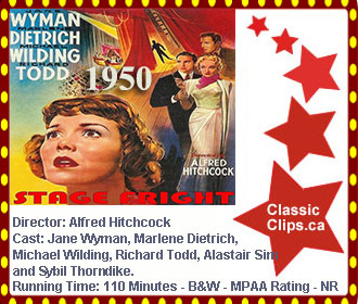 STAGE FRIGHT (1950) The police think actor Jonathan Cooper (Richard Todd) is a murderer, and now they're on his tail. He asserts that it was his lover, the famous actress Charlotte Inwood (Marlene Dietrich), who killed the victim (not coincidentally, her husband). He seeks shelter with his ex-girlfriend Eve (Jane Wyman), a budding actress. Convinced Jonathan is innocent, Eve plays detective and assumes multiple disguises. But once she is entangled in a web of deception, she fears everyone in fact wears a mask. Director: Alfred Hitchcocki. Cast: Jane Wyman, Marlene Dietrich, Michael Wilding, Richard Todd, Alastair Sim and Sybil Thorndike. |