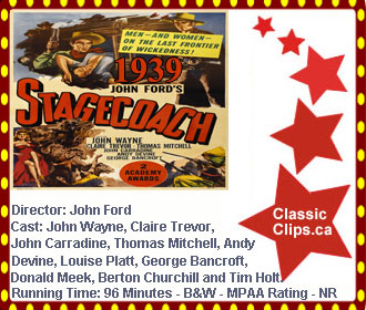 STAGECOACH (1939) John Ford's landmark Western revolves around an assorted group of colorful passengers aboard the Overland stagecoach bound for Lordsburg, New Mexico, in the 1880s. An alcoholic philosophizer (Thomas Mitchell), a lady of ill repute (Claire Trevor) and a timid liquor salesman (Donald Meek) are among the motley crew of travelers who must contend with an escaped outlaw, the Ringo Kid (John Wayne), and the ever-present threat of an Apache attack as they make their way across the Wild West. Director: John Ford. Cast: John Wayne, Claire Trevor, John Carradine, Thomas Mitchell, Andy Devine, Louise Platt, George Bancroft, Donald Meek, Berton Churchill and Tim Holt. |