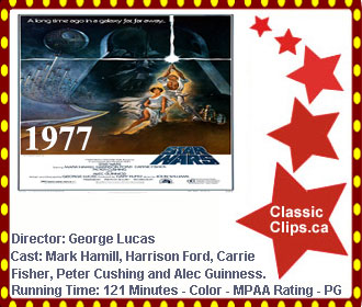STAR WARS (1977) The Imperial Forces -- under orders from cruel Darth Vader (David Prowse) -- hold Princess Leia (Carrie Fisher) hostage, in their efforts to quell the rebellion against the Galactic Empire. Luke Skywalker (Mark Hamill) and Han Solo (Harrison Ford), captain of the Millennium Falcon, work together with the companionable droid duo R2-D2 (Kenny Baker) and C-3PO (Anthony Daniels) to rescue the beautiful princess, help the Rebel Alliance, and restore freedom and justice to the Galaxy. Director: George Lucas. Cast: Mark Hamill, Harrison Ford, Carrie Fisher, Peter Cushing and Alec Guinness. |