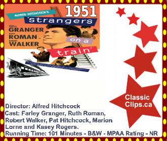 STRANGERS ON A TRAIN (1951) Tennis star Guy Haines (Farley Granger) is enraged by his trampy wife's refusal to finalize their divorce so he can wed senator's daughter Anne (Ruth Roman). He strikes up a conversation with a stranger, Bruno Anthony (Robert Walker), and unwittingly sets in motion a deadly chain of events. Psychopathic Bruno kills Guy's wife, then urges Guy to reciprocate by killing Bruno's father. Meanwhile, Guy is murder suspect number one. Director: Alfred Hitchcock. Cast: Farley Granger, Ruth Roman, Robert Walker, Pat Hitchcock, Marion Lorne and Kasey Rogers. |