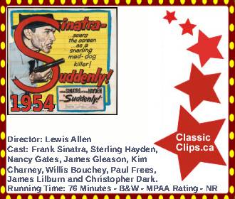 SUDDENLY (1954) In advance of a presidential visit to the small town of Suddenly, California, a trio of FBI agents enters the Benson family's home to assess potential security risks. Once inside, leader John Baron (Frank Sinatra) reveals himself as a psychopathic assassin, and he kidnaps the family in order to use their house as his vantage point in his plot to kill the president. Sheriff Tod Shaw (Sterling Hayden) matches wits with the assassin and his gang in an attempt to save the day. Director: Lewis Allen. Cast: Frank Sinatra, Sterling Hayden, Nancy Gates, James Gleason, Kim Charney, Willis Bouchey, Paul Frees, James Lilburn and Christopher Dark. |
