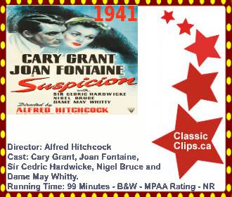 SUSPICION (1941) Charming scoundrel Johnnie Aysgarth (Cary Grant) woos wealthy but plain Lina McLaidlaw (Joan Fontaine), who runs away with him despite the warnings of her disapproving father (Cedric Hardwicke). After their marriage, Johnnie's risky financial ventures cause Lina to suspect he's becoming involved in unscrupulous dealings. When his dear friend and business partner, Beaky (Nigel Bruce), dies under suspicious circumstances on a business trip, she fears her husband might kill her for her inheritance. Director: Alfred Hitchcock. Cast: Cary Grant, Joan Fontaine, Sir Cedric Hardwicke, Nigel Bruce and Dame May Whitty. |