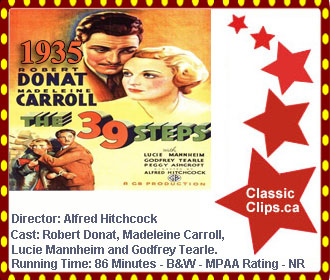 THE 39 STEPS (1935) While on vacation in London, Canadian Richard Hannay (Robert Donat) becomes embroiled in an international spy ring related to the mysterious "39 steps." Then he meets agent Annabella Smith (Lucie Mannheim), who is soon killed in his apartment. He must elude the police, who are hunting him for murder, while he tries to stop Professor Jordan (Godfrey Tearle) from sending secrets out of the country. Hannay is assisted by Pamela (Madeleine Carroll), an unwilling accomplice who discovers the truth. Director: Alfred Hitchcock. Cast: Robert Donat, Madeleine Carroll, Lucie Mannheim and Godfrey Tearle. |