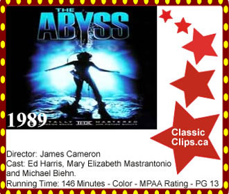 THE ABYSS (1989) When an American nuclear submarine crashes, the United States Government believe the Russians to be responsible. They enlist the help of a team of underwater drilling platform workers who are to help the deployed Navy SEALS locate the crash site. As they get closer to their destination, the friction between the two teams increases. When some workers report seeing UFO's underwater, the SEALS grow increasingly suspicious and suspect a Russian mini-sub. After a series of near-fatal disasters, the workers find that they are the only people who are capable of stopping World War III. But they are not the only inhabitants of the deep, and strange things are happening back at the surface. Director: James Cameron. Cast: Ed Harris, Mary Elizabeth Mastrantonio and Michael Biehn. |