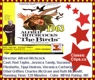 THE BIRDS (1963) An innocuous romantic triangle involving wealthy, spoiled Melanie Daniels (Tippi Hedren), handsome Mitch Brenner (Rod Taylor), and schoolteacher Annie Hayworth (Suzanne Pleshette) turns into a supernatural, horror mystery as their sense of security is slowly eroded by the curious behavior of the birds in the area. At first it's no more than a sea gull swooping down and pecking at Melanie's head. But things take a nasty turn when hundreds of birds suddenly, for no apparent reason, converge on a children's party, then in droves at a school yard and finally, randomly, in swooping, dive bombing numbers against the citizens of the town of Bodega Bay itself. Director: Alfred Hitchcock. Cast: Rod Taylor, Jessica Tandy, Suzanne Pleshette, Tippi Hedren, Veronica Cartwright, Ethel Griffies, Charles McGraw, Ruth McDevitt, Lonny Chapman, Joe Mantell, Doodles Weaver and Malcolm Atterbury. |