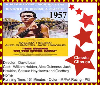 THE BRIDGE ON THE RIVER KWAI (1957) Prisoners of war during World War II are ordered to build a bridge to accommodate the Burma-Siam railway. Their instinct is to sabotage the bridge but, under the leadership of Colonel Nicholson (Alec Guinness), they are persuaded that the bridge should be constructed as a symbol of British morale, spirit and dignity in adverse circumstances. At first, the prisoners admire Nicholson when he bravely endures torture rather than compromise his principles for the benefit of the Japanese commandant Saito. He is an honorable but arrogant man, who is slowly revealed to be a deluded obsessive. He convinces himself that the bridge is a monument to British character, but actually is a monument to himself, and his insistence on its construction becomes a subtle form of collaboration with the enemy. Unknown to him, the Allies have sent a mission into the jungle, led by Major Warden (Jack Hawkins), a member of the British Special Forces and American Navy Commander Shears (William Holden), to blow up the bridge. Director: David Lean. Cast: William Holden, Alec Guinness, Jack Hawkins, Sessue Hayakawa and Geoffrey Horne. |