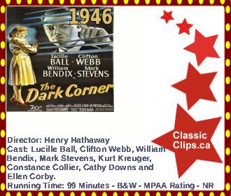 THE DARK CORNER (1946) When Bradford Galt (Mark Stevens), a tough private investigator, realizes that he's being followed, he confronts his assailant, a shifty fellow named Fred Foss (William Bendix). Galt's encounter with Foss leads to a web of intrigue involving prosperous art collector Hardy Cathcart (Clifton Webb) and his young wife, Mari (Cathy Downs). Soon Galt is in over his head, but luckily for him, his tenacious secretary, Kathleen Stewart (Lucille Ball), is on hand to help him out. Director: Henry Hathaway. Cast: Lucille Ball, Clifton Webb, William Bendix, Mark Stevens, Kurt Kreuger, Constance Collier, Cathy Downs and Ellen Corby. |