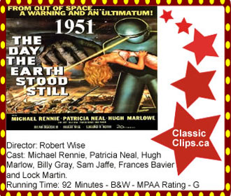 THE DAY THE EARTH STOOD STILL (1951) A flying saucer orbits the Earth and lands in Washington, DC, on the Mall. The lone occupant steps out and is shot by a jumpy soldier. Gort, a large and very powerful robot appears to save him and is able to melt tanks with the slightest bit of his power. The wounded alien orders Gort to stop his rampage and is taken to a hospital from which he escapes in order to learn more about this planet, even moving in as a boarder with an Earth family. When they begin to suspect him, he reveals himself, along with the news that Gort is a member of a race of super-robot enforcers invented to keep the peace of the galaxy that will destroy the Earth if provoked. Director: Robert Wise. Cast: Michael Rennie, Patricia Neal, Hugh Marlow, Billy Gray, Sam Jaffe, Frances Bavier and Lock Martin. |