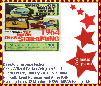 THE EARTH DIES SCREAMING (1964) British astronaut Jeff Nolan returns to earth to find his hometown has been invaded by a robot army. Controlled by an alien race bent on the domination of Earth, the robots use a poison gas to turn the humans into zombie-like creatures. Director: Terence Fisher. Cast: Willard Parker, Virginia Field, Dennis Price, Thorley Walters, Vanda Godsell, David Spenser and Anna Palk. |