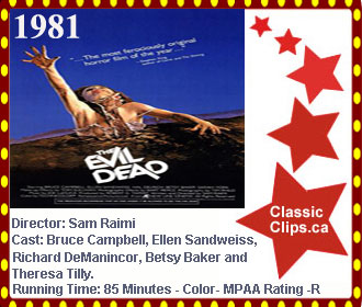 THE EVIL DEAD (1981) Ashley "Ash" Williams (Bruce Campbell), his girlfriend and three pals hike into the woods to a cabin for a fun night away. There they find an old book, the Necronomicon, whose text reawakens the dead when it's read aloud. The friends inadvertently release a flood of evil and must fight for their lives or become one of the evil dead. Ash watches his friends become possessed, and must make a difficult decision before daybreak to save his own life. Director: Sam Raimi. Cast: Bruce Campbell, Ellen Sandweiss, |